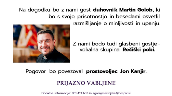 Na dogodku bo z nami gost duhovnik Martin Golob, ki bo s svojo prisotnostjo in besedami osvetlil razmišljanje o minljivosti in upanju.