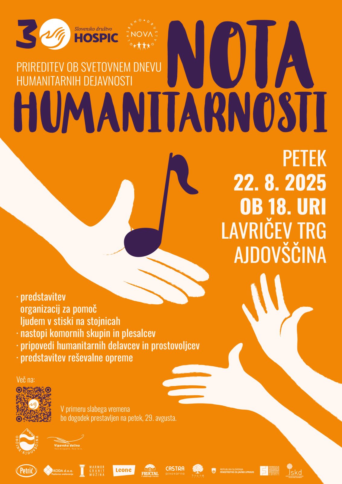 Slovensko društvo Hospic in Glasbeno društvo NOVA vas vabimo na prireditev ob svetovnem dnevu humanitarnih dejavnosti, na kateri želimo osveščati o različnih stiskah ljudi in vseh ljudeh, ki jim priskočijo na pomoč. Pogosto ne vemo, kje poiskati pomoč in kakšne oblike podpore so nam na voljo, zato je pomembno, da se o tovrstnih tematikah pogovarjamo na zanimiv in sproščen način.
