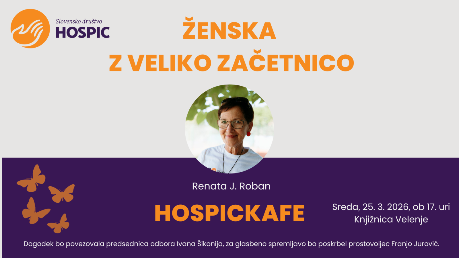 PriporočeniKnjižnica Velenje Šaleška cesta 21,VelenjeSreda, 25. 3. 2026, ob 17. uri Knjižnica Velenje Na tokratnem dogodku se bomo pogovarjali z Renato J. Roban, predsednico